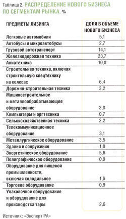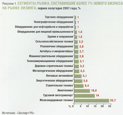 Основная доля нового бизнеса, согласно исследованию агентства «Эксперт РА», в первом полугодии 2007 года традиционно пришлась на железнодорожный и автомобильный транспорт, а также на авиационную и строительную технику (табл. 2). Сегменты оборудования для пищевой индустрии, а также упаковочного и торгового оборудования составили вместе чуть более 5% рынка (рис. 1).