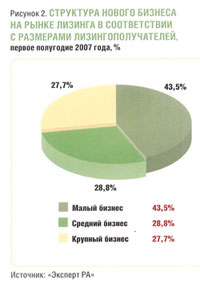 Участники лизингового рынка отмечают значительное повышение спроса на лизинг со стороны малого и среднего бизнеса (рис. 2). «Наибольший и постоянный спрос на лизинговые услуги предъявляют компании среднего бизнеса, сделки с ними составляют более половины нашего портфеля. Заметно растет заинтересованность в лизинге у малого бизнеса, это мы особенно ощутили в первом полугодии 2007 года. Это явное свидетельство усилий лизинговых компаний в привлечении внимания этой целевой аудитории, очень хороший пример взаимной заинтересованности в движении навстречу друг другу финансовых структур и бизнеса», — говорит генеральный директор ОАО «Лизинговая компания «КамАЗ» А. Гарифуллина.
