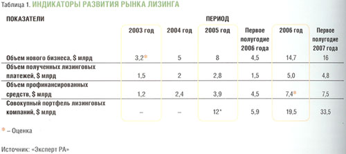 Рост рынка лизинга оправдал самые смелые ожидания — за первое полугодие 2007 года лизингодатели заключили договоров лизинга на сумму, превышающую общую сумму договоров за весь 2006 год. Объем нового бизнеса, по данным «Эксперт РА», составил $ 16 млрд, а общий портфель лизинговых компаний — $ 33,5 млрд. К концу 2007 года объем нового бизнеса может составить около $ 35-37 млрд при сохранении таких же темпов развития (табл. 1).
