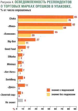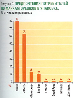 Самыми распространенными орешками в упаковке, потребляемыми респондентами, является продукция под торговыми марками Chaka и «Жико», которой соответственно, отдают предпочтение 81 и 64% опрошенных. Только 14 и 11% респондентов покупали в качестве перекуса орешки торговых марок «Клинские» и Big-Bon, а на долю каждой из таких марок, как EMarko («Рибер энд Сан Раша Продакшн»), Good-Food (ООО «Гуд-Фуд», Москва), Mivimex (ЗАО «Масан Рус Трейдинг», Москва) и «ХитНатс» (ЗАО «Фабрика «Золотые купола», Московская область), пришлось лишь по 2% покупок.