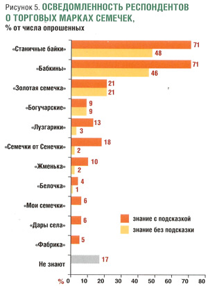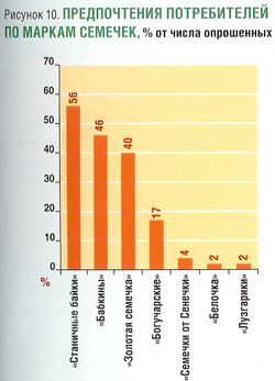 По сравнению с перечисленными категориями снеков, расфасовка семечек в упаковку является относительно новым наравлением. Несмотря на это, потребители на сегодняшний день способны выделить наиболее предпочтительные торговые марки в этом сегменте. Так, самыми покупаемыми являются семечки марок «Станичные Байки» - их предпочитают 56% воронежцев, «Бабкины» - 46% и «Золотая семечка» - 40% опрошенных. Известными и покупаемыми также являются семечки «Богучарские» (ООО «Агроспутник», г.Богучар Воронежской области) - они пользуются спросом у 17% респондентов.