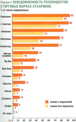 Высокая концентрация торговых марок, узнаваемых покупателями, отмечена по группам товаров «Сухарики» и «Чипсы». Так, пятерку лидеров у сухариков в этом рейтинге составляют «Кириешки» (ЗАО «УК «Сибирский берег», г. Новосибирск), «З Корочки» (ЗАО «Бриджтаун Фудс», Москва), «Клинские» (ЗАО «Планета вкуса», Москва), «Компашки» и «Бомбастер» (обе марки - «Сибирский берег»).