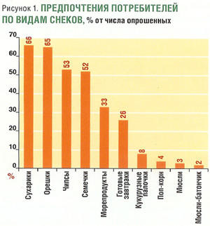 Потребление снеков в России в настоящее время, по оценкам экспертов, составляет 1,5 килограмма в год на одного жителя, в то же время среднедушевое потребление в Западной Европе составляет 10 килограммов в год. Сохраняющаяся тенденция ускорения ритма жизни определяет потенциал развития рынка снеков в России. Поскольку такая продукция является товаром импульсного спроса, для продвижения торговых марок здесь необходим агрессивный маркетинг. В частности, большое внимание уделяется рекламе. Причем рекламная стратегия должна разрабатываться отдельно для каждого сегмента, учитывая потребительские предпочтения и ситуации потребления.