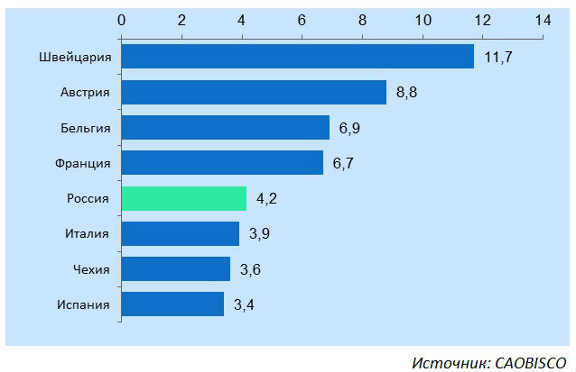 Для сравнения: потребление шоколада в Швейцарии в 2014 г. составило 11,7 кг на душу населения в год, в Германии — 12,2 кг. Ещё в первую десятку по потреблению шоколада входят Норвегия, Великобритания, Ирландия, Австрия, Дания, Финляндия, Бельгия, Франция.