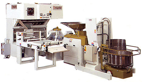 В состав линии SOTTORIVA входит оборудование: - саморазгружающаяся тестомесильная машина - поршневой тестоделитель - конический округлитель - камера предварительной расстойки заготовок - формовочная машина