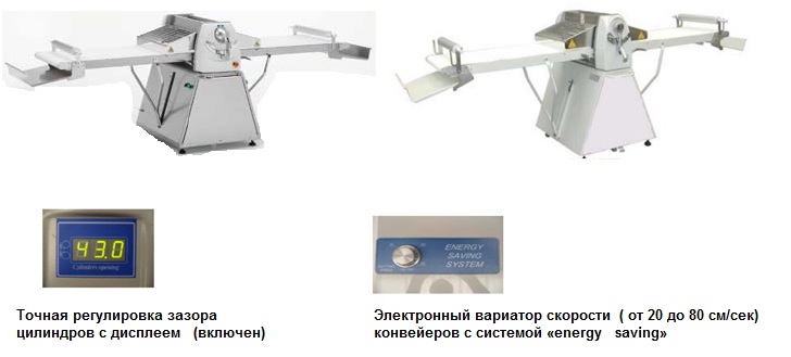 Оснащены конвейерами, имеющими разную скорость. Обозначены степени опускания цилиндра для регулировки точности раскатки. Данные тестораскатки прочные, надежные, долговечные, обеспечивают спокойную и бесперебойную работу. Управляются вручную при помощи рычага.