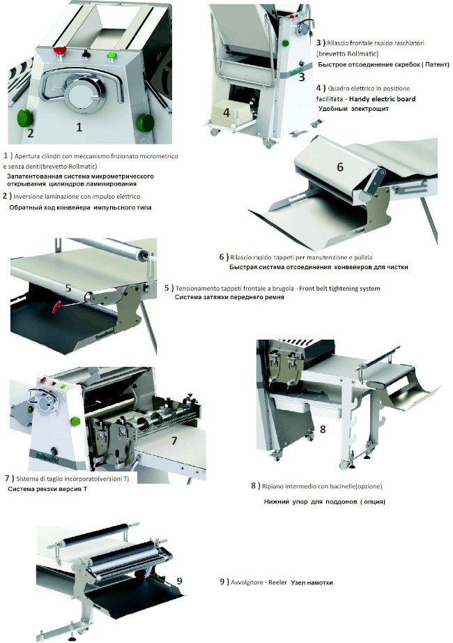Тестораскаточная машина с основой на колёсах, доступна в версии со встроенной системой нарезки (R65 S-T). Складные и съёмные рабочие столы. Реверсирование направления движения посредством кнопок с электрическим импульсом и педали. Сенсорный дисплей 4,5”, 50 рабочих программ с программированием скорости, открытия цилиндров и посыпочного устройства (опция). Защитные покрытия цилиндров оборудованы микровыключателем безопасности и газовой пружиной. Система быстрого натяжения и открепления лент. Скребки с системой быстрого открепления QR (Quick Release), патент Rollmatic. Ящик для сбора муки оборудован микровыключателем безопасности.