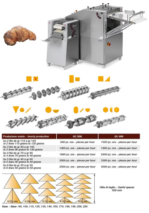 ТЕХНИЧЕСКИЕ ХАРАКТЕРИСТИКИ: •GC 2000 максимальная производительность около 2 500 шт. / час ( мини - круассанов на 6 рядов ) •GC 4000 максимальная производительность около 4 000 шт. / час ( мини - круассанов на 6 рядов ) •потребляемая мощность кВт 1,5 – 380 В •вес 500/550 кг •ширина ленты 540 мм В комплект поставки включены: