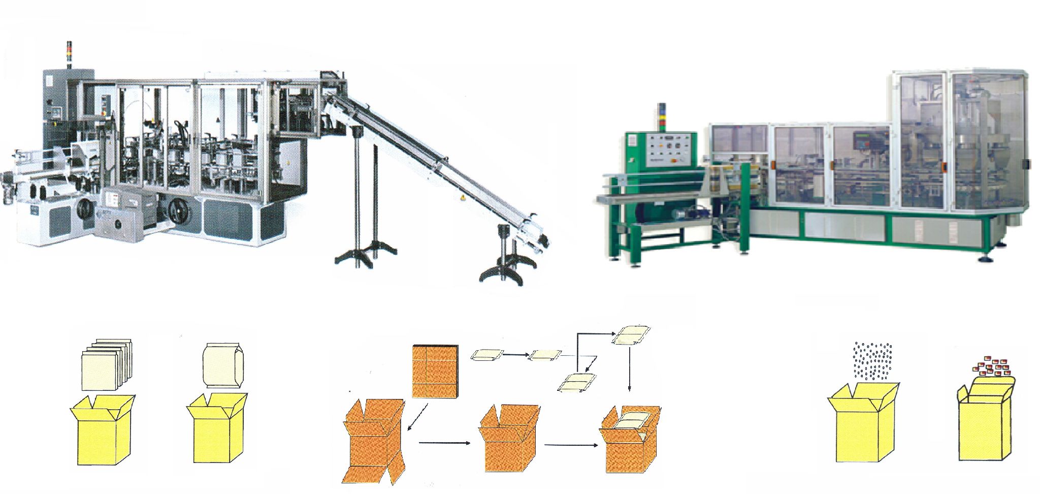 Картон (предварительно сложенный, плоские заготовки) подвергается операциям: формовка коробки, склеивание дна коробки, подача на узел наполнения к весовому дозатору или на узел укладки пакетов в коробку. Далее, коробка с продуктом закрывается, заклеивается верхний клапан, далее коробка попадает на отводной транспортер готового продукта.