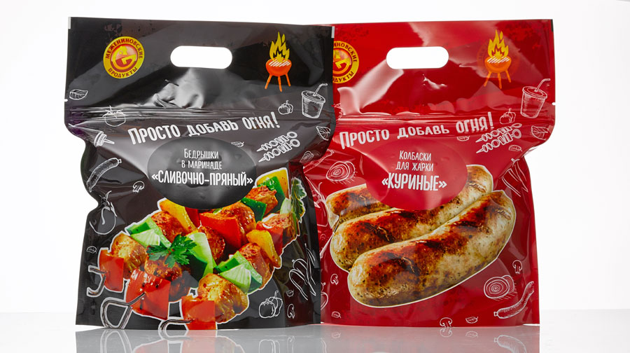 Межениновская птицефабрика (Томск) выпустила шашлыки и колбаски для гриля в новой удобной упаковке дой-пак с ручкой и замком zip-lock.